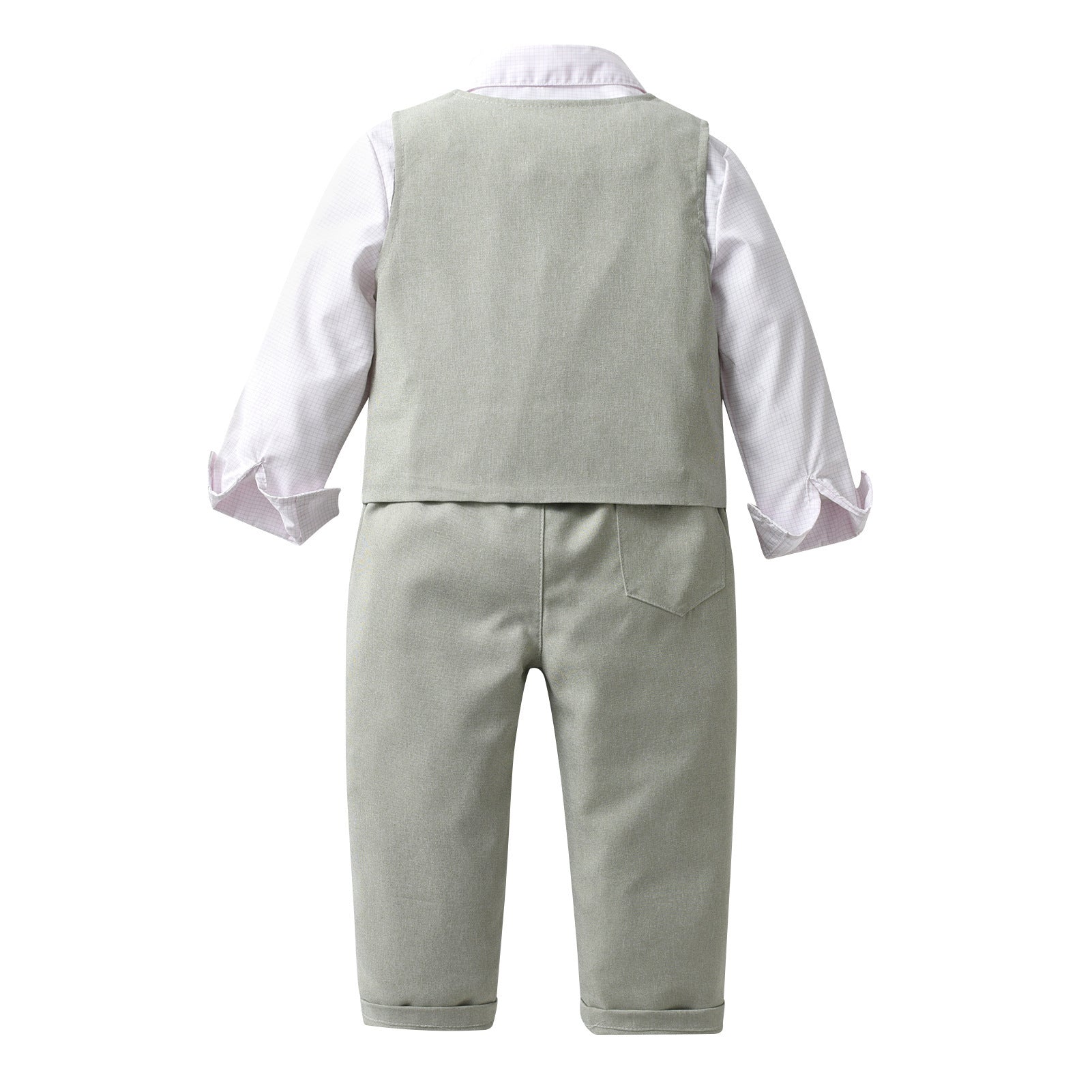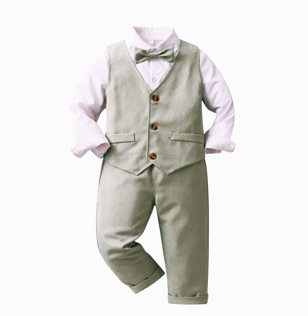 Camisa blanco con cuadrille rosa moño, chaleco y pantalón verde