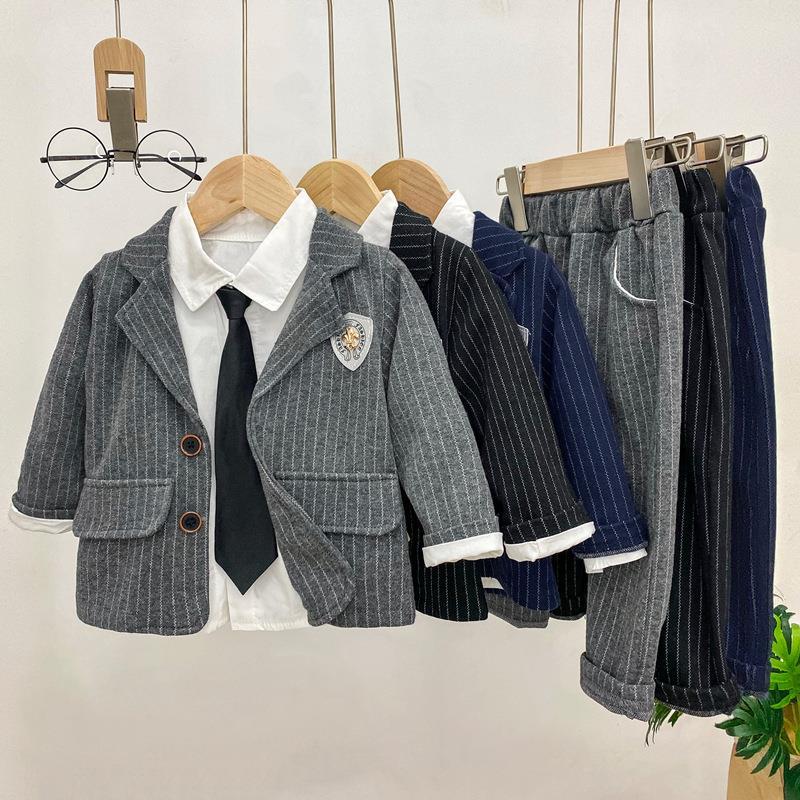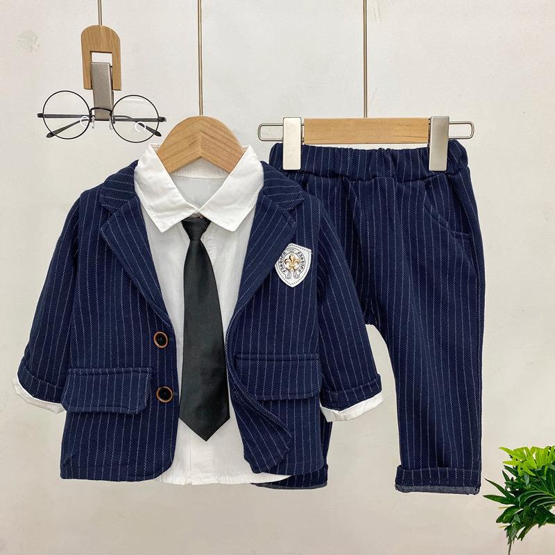 Camisa blanca con corbata, saco y pantalón a rayas