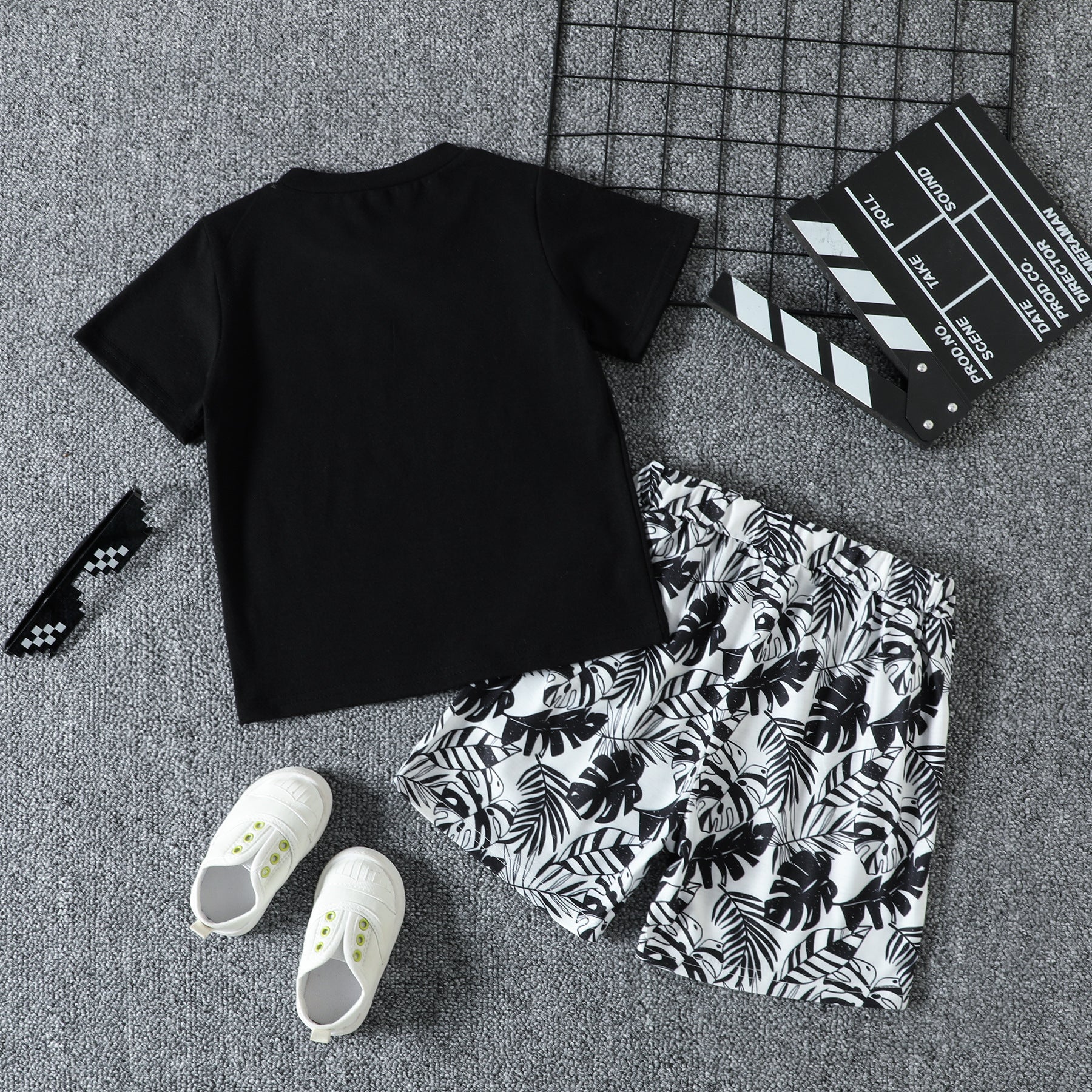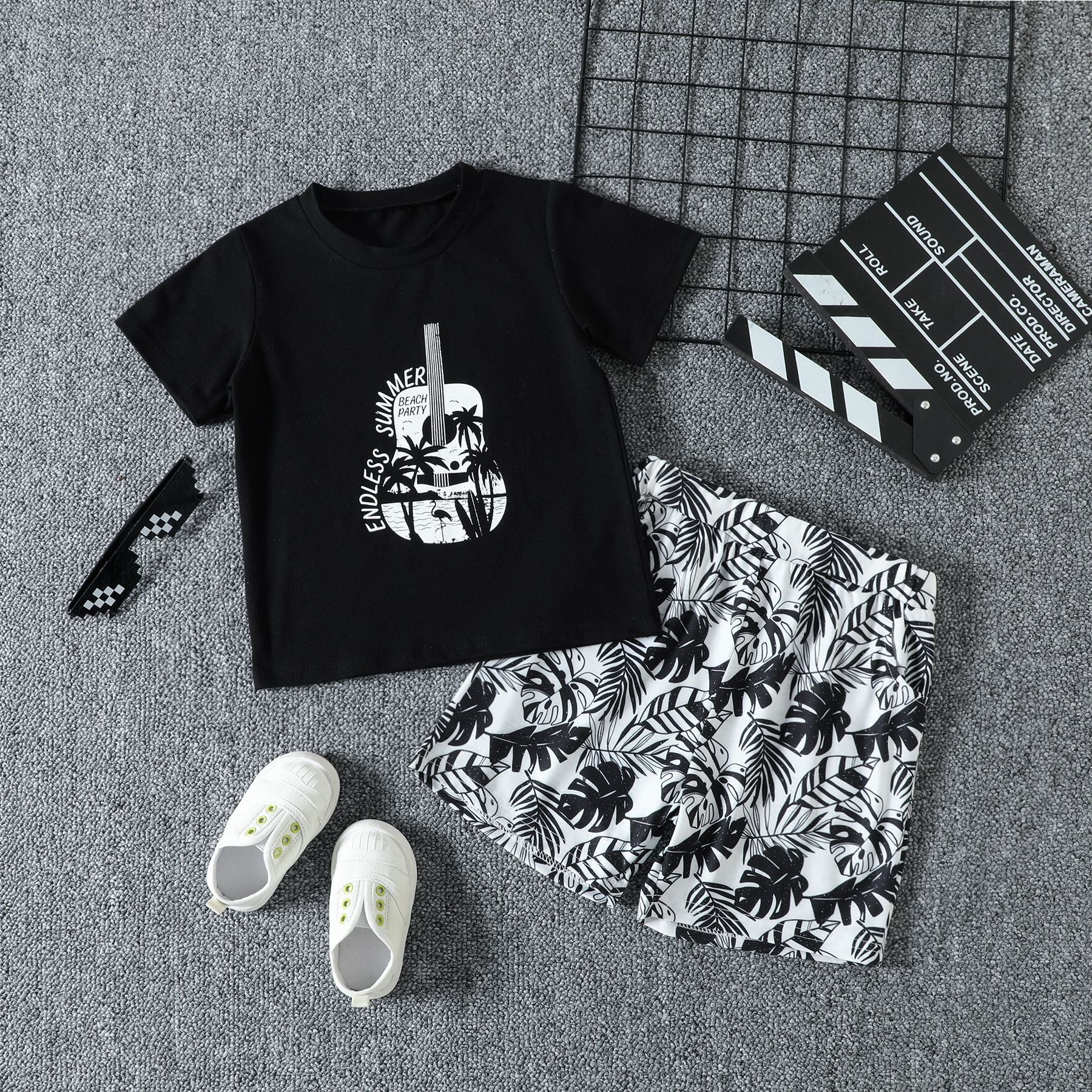 Remera negro de guitarra y short con estampas de hojas