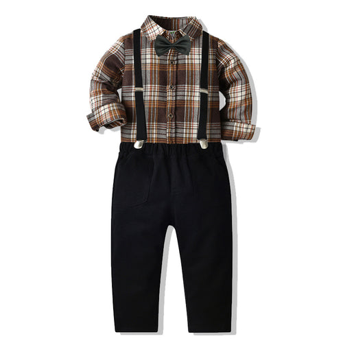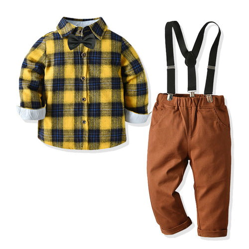 Camisa amarillo cuadrille con moño y pantalón marrón con tirante