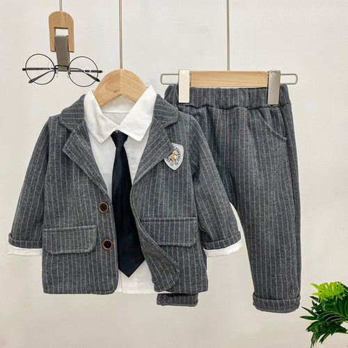 Abrigo gris cuadrille, camisa blanca con corbata y pantalón marrón