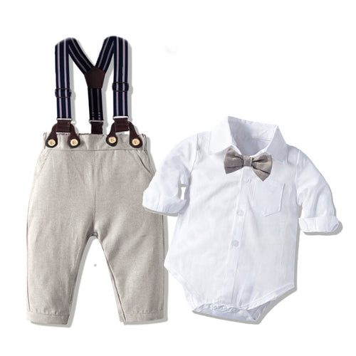 Body camisa blanca con moño y pantalón marrón con tirante