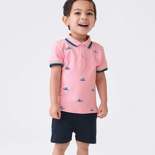 Remera rosa con estampas de autos y short azul marino