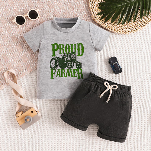 Remera gris con estampa de tractor y short negro