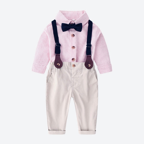 Camisa a rayas con pantalón gris y tirante con moño