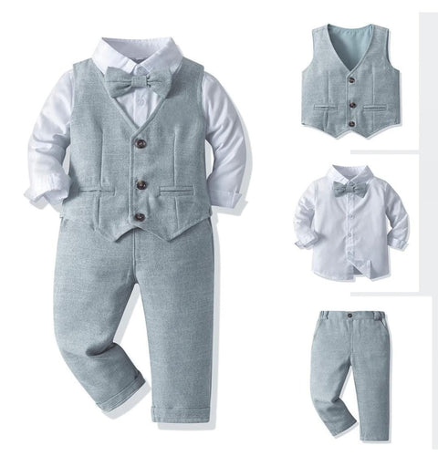 Camisa blanca con moño, chaleco y pantalón gris celeste