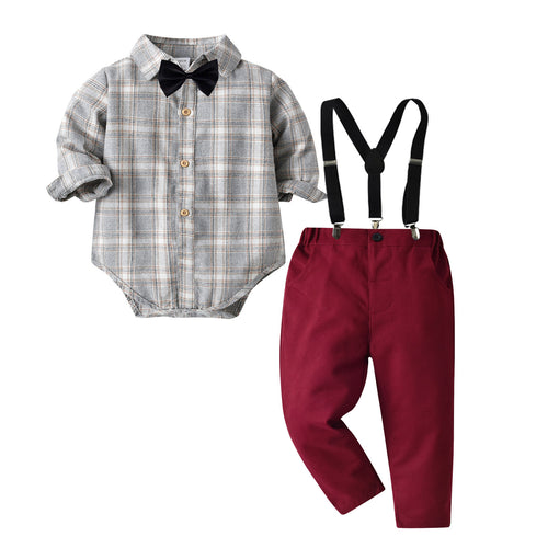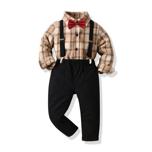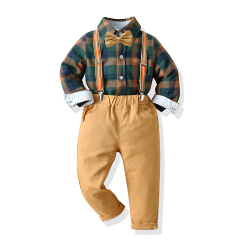 Camisa verde cuadrille con moño y pantalón caqui con tirante