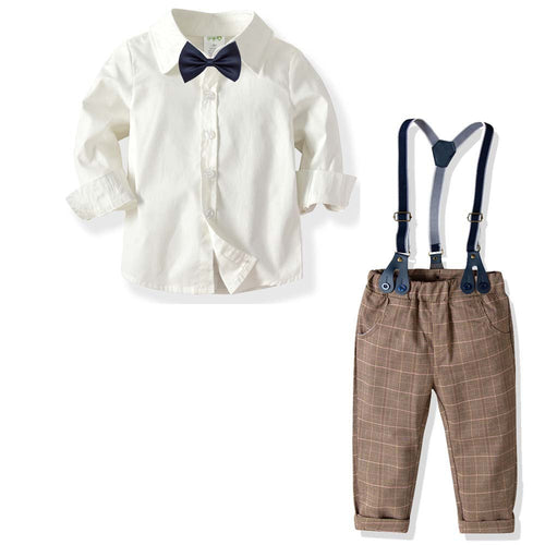 Camisa blanca con moño y pantalón cuadrille marrón con tirante