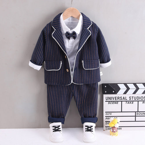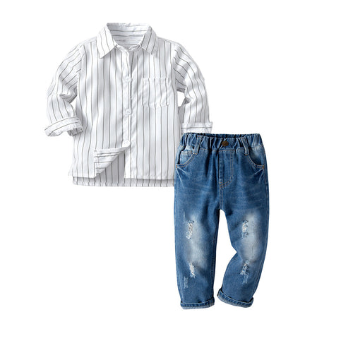 Remera mangas largas con cuello, saco y pantalón azul a rayas con bies blanco