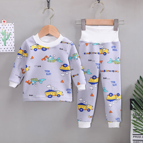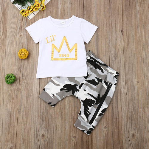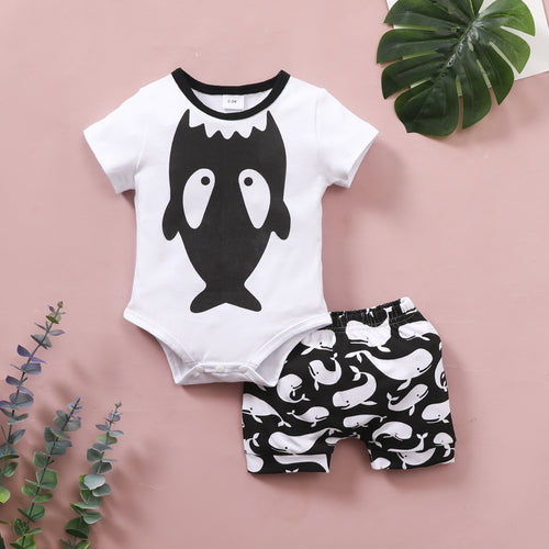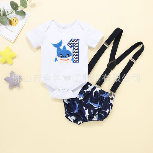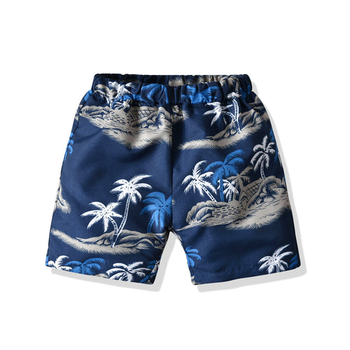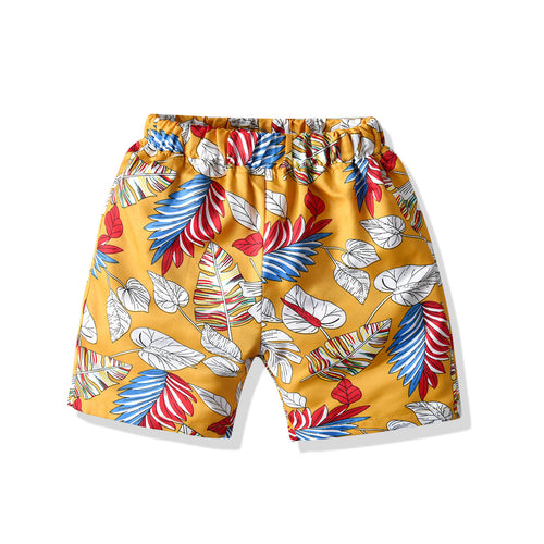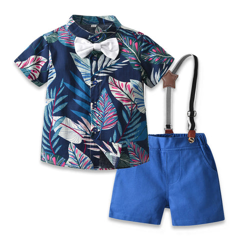 Camisa estampado de hojas, con moño blanco y short azul con tirantes