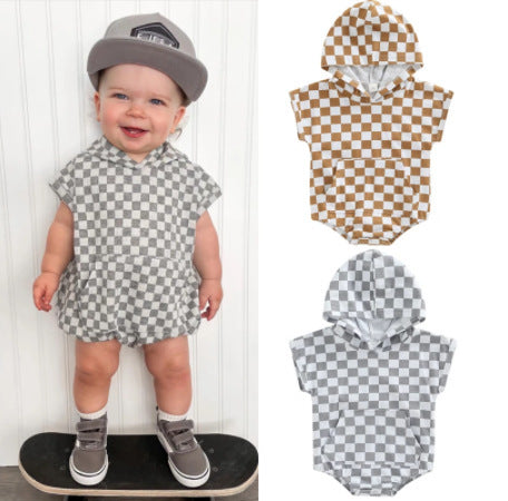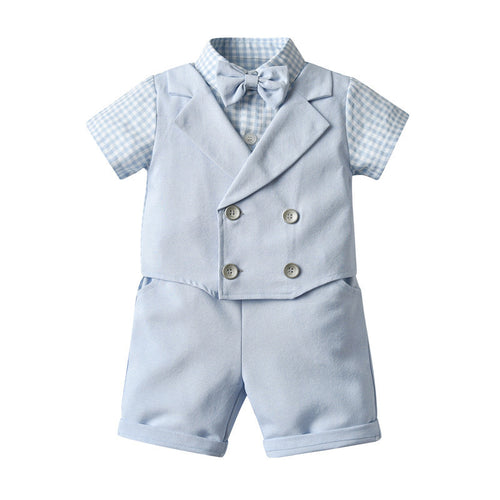 Camisa cuadrille celeste con falso chaleco, short y moño