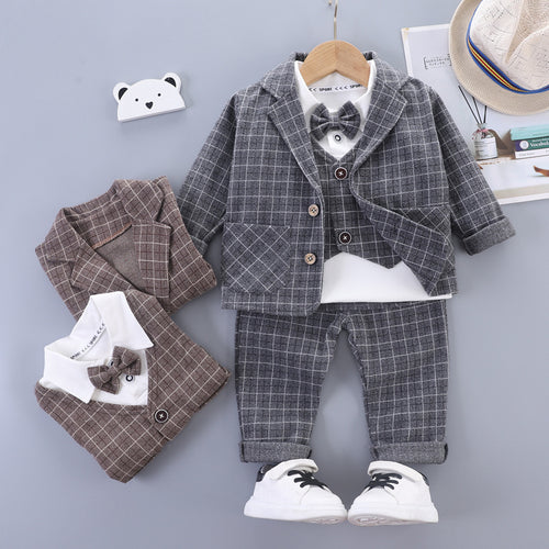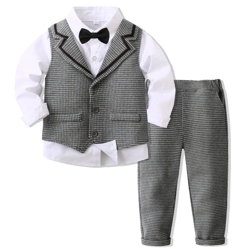 Camisa blanca con moño negro, chaleco y pantalón cuadrille gris