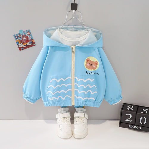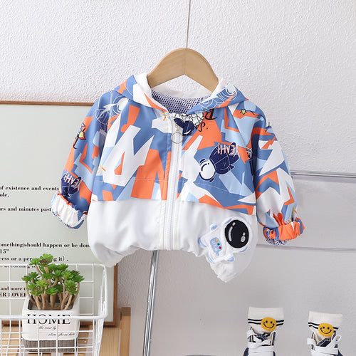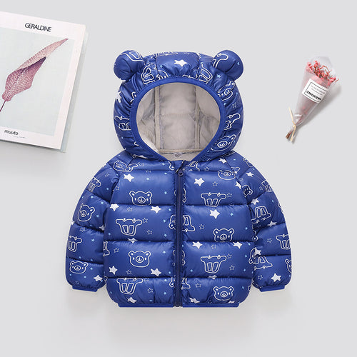 Campera de pluma azul con estampas de vehículos y capucha con orejas