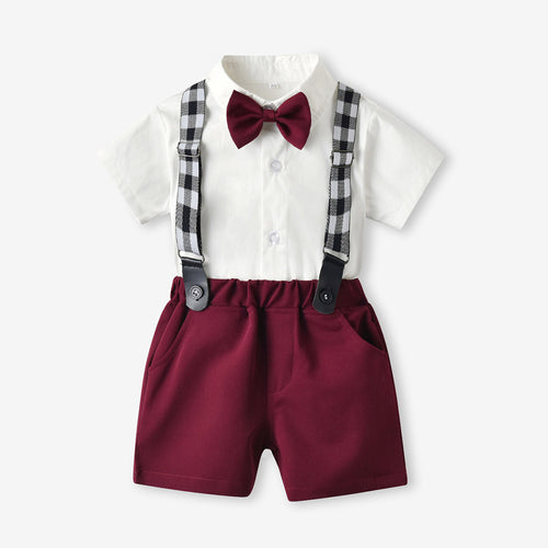 Camisa blanco con short y moño bordo, tirante cuadrille