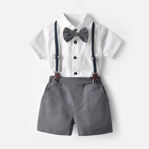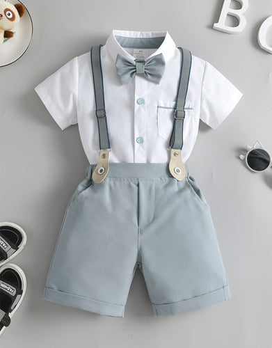 Camisa blanco con short, moño gris oscuro y tirante azul marino