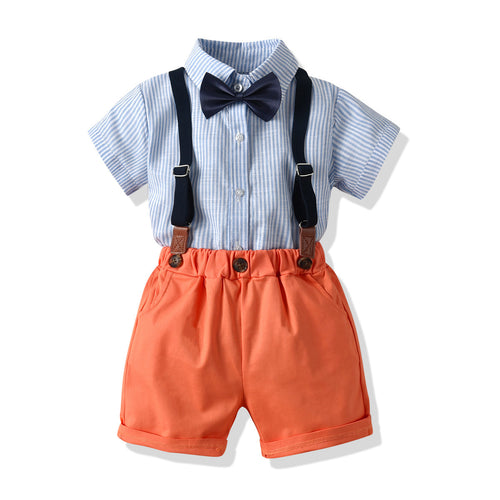 Camisa a rayas celeste, moño con tirante negro y short naranja