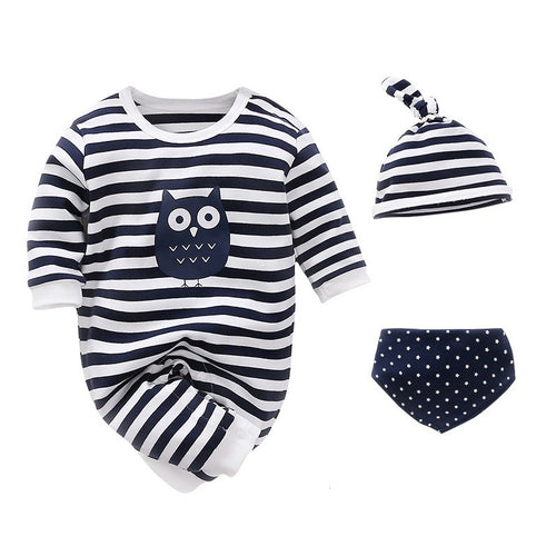 Body enterizo blanco con rayas azul, diseño de búho con gorra y babero