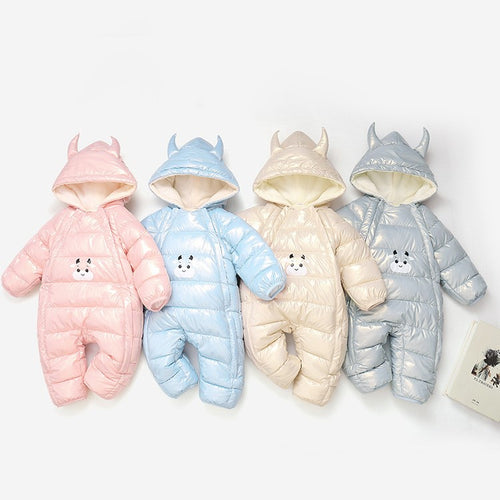 Campera de pluma beige con estampas de naves y capucha con orejas