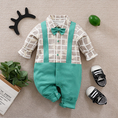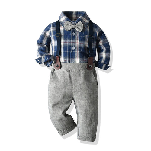 Camisa azul cuadrille, pantalón gris con tirantes y moño