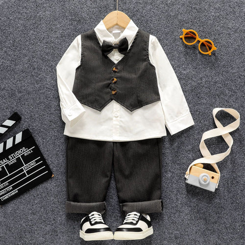 Camisa blanca con falso chaleco y pantalón negro, incluye moño