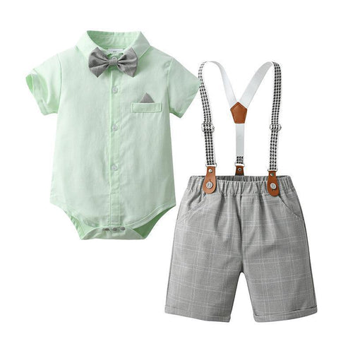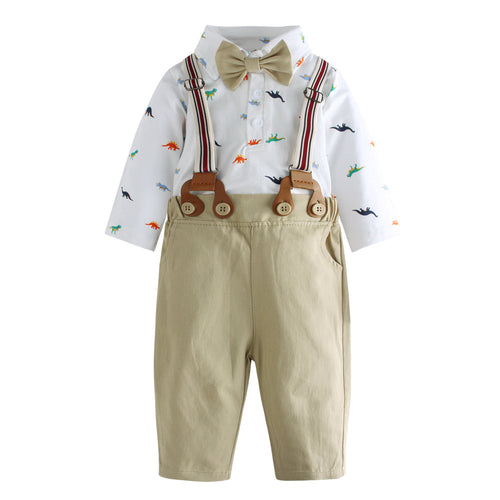 Body camisa blanca de dino con moño,pantalón beige y tirante