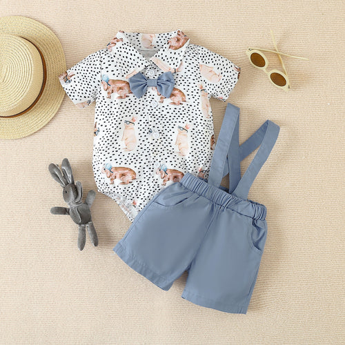 Body blanco con estampas de conejos, short con tirante y moño gris
