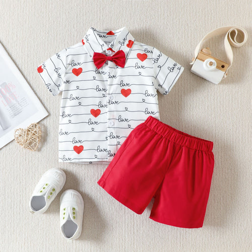 Camisa blanca con estampas de corazones con letras y short rojo con moño