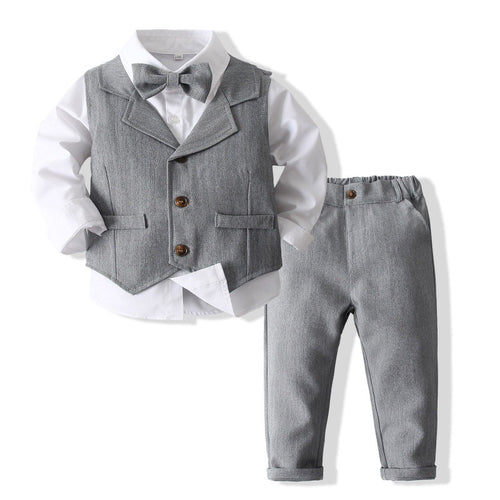 Camisa blanca con moño, chaleco y pantalón azul marino cuadrille