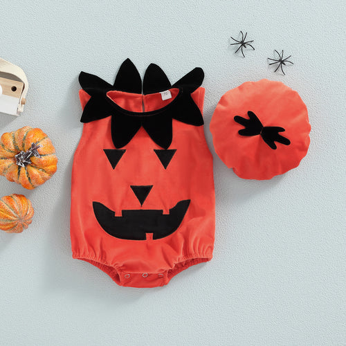 Camisa blanca con estampas de calabaza y pantalón con tirantes naranja