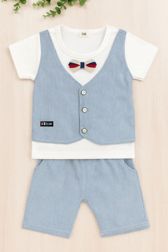 Remera blanca con moño, falso chaleco y short celeste a rayas