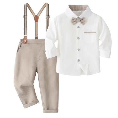 Camisa blanca con moño y pantalón con tirante beige a rayas