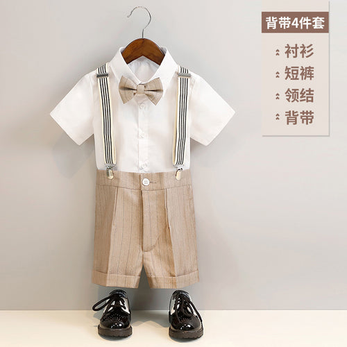 Camisa blanca con moño y short o pantalón a rayas con tirante beige