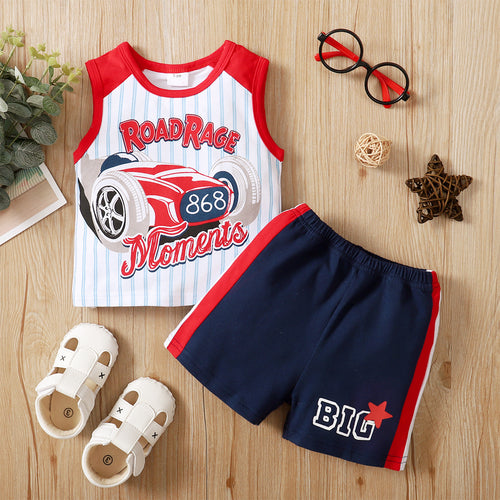 Camisilla con estampa de auto y letras, short azul con rayas al costado
