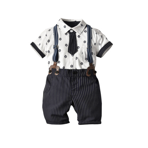 Camisa blanco con corbata, tirantes y short azul a rayas