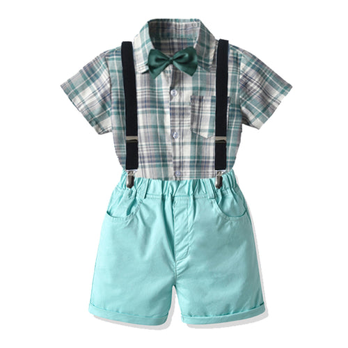 Camisa cuadrille verde, short celeste, tirantes, moño
