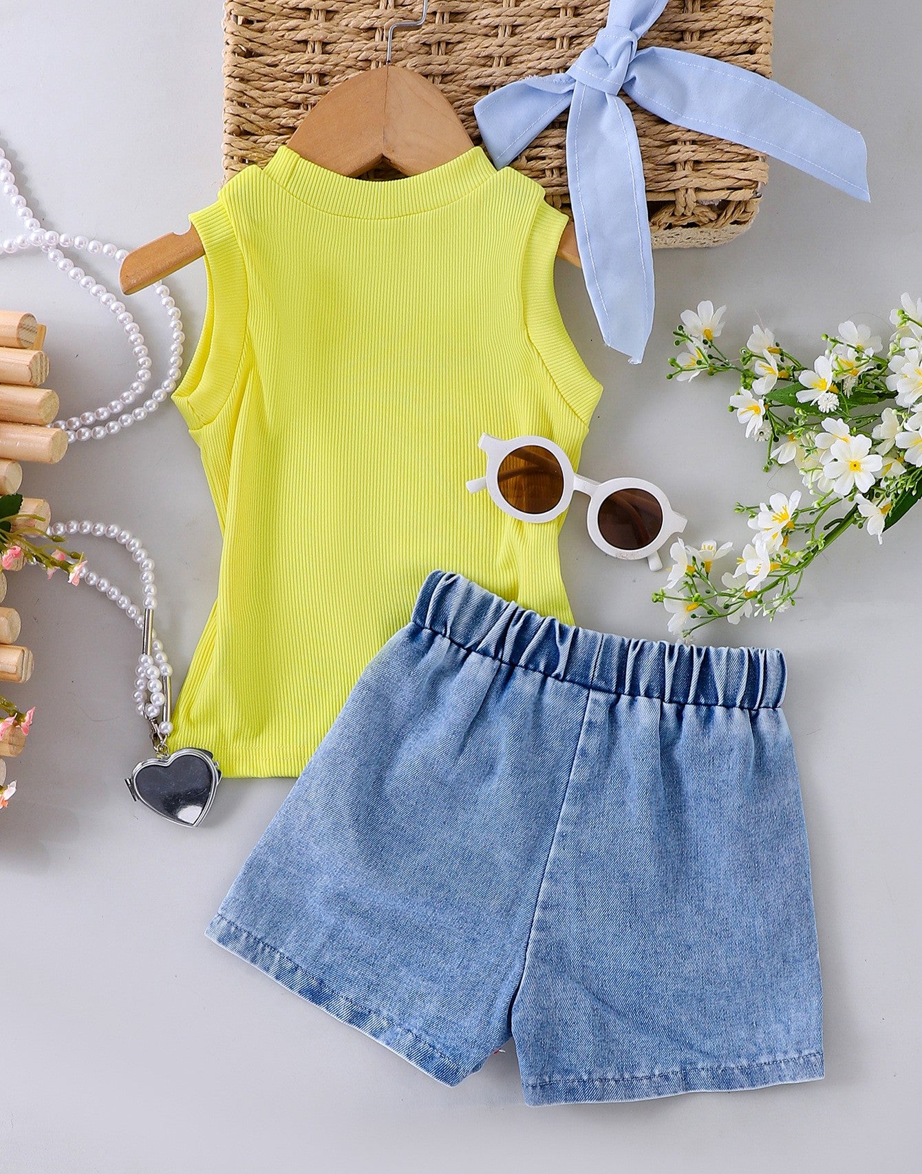 Blusa amarillo y short jeans con bordados de flor